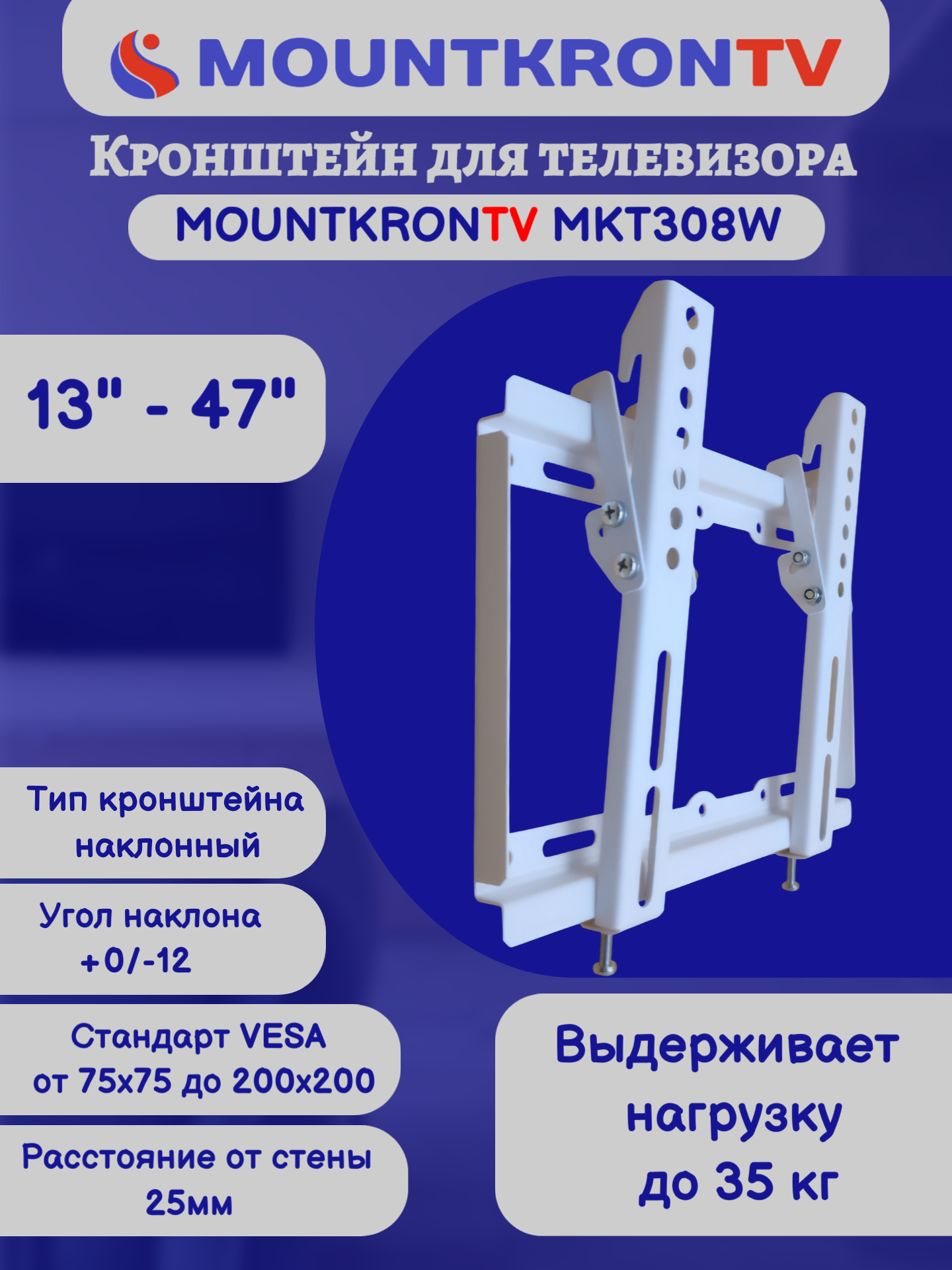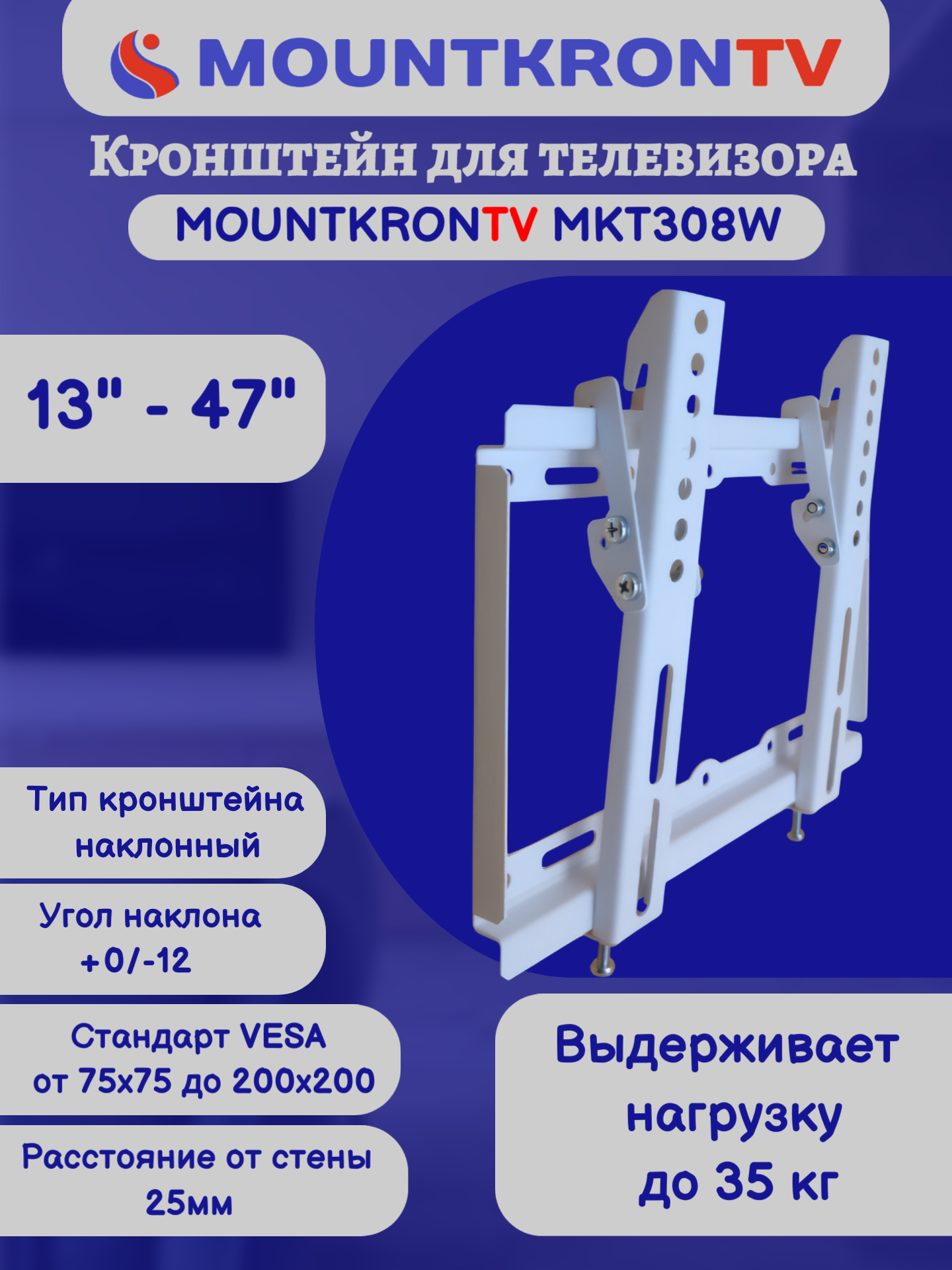 Кронштейн для телевизора MOUNTKRONTV MKT308W на стену, наклонный, диагональ 13"-47", белый информация: