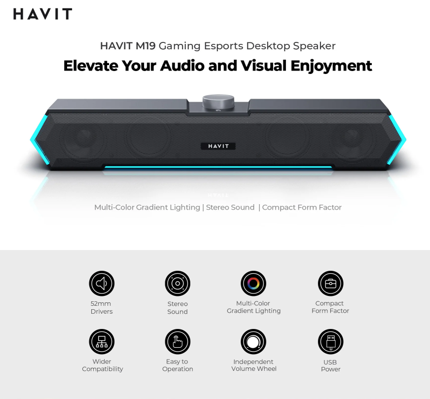 Отзывы на Активный саундбар Havit M19, объемный звук 2.0 , RGB подсветка, черный [AUX]
