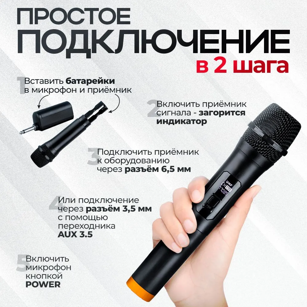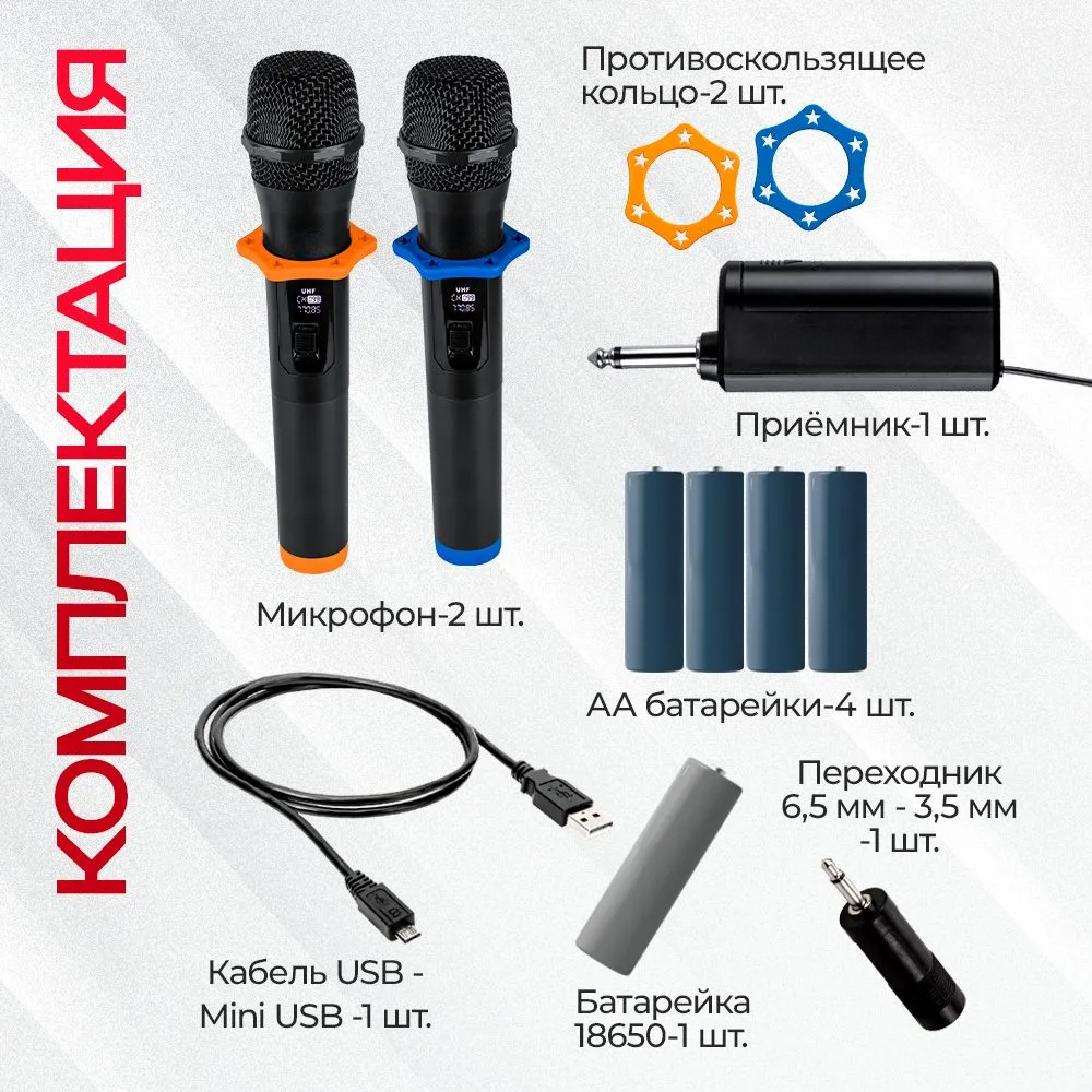 Беспроводной микрофон, микрофон для караоке беспроводной, 2 микрофона, комплект, приемник, переходник AUX, черный информация: