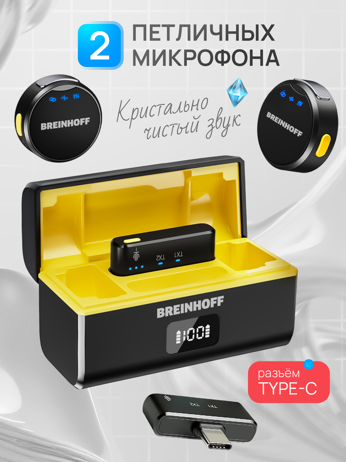 Отзывы на Микрофон петличный беспроводной двойной BREINHOFF CRYSTAL с разъёмом Type-C и с зарядным кейсом