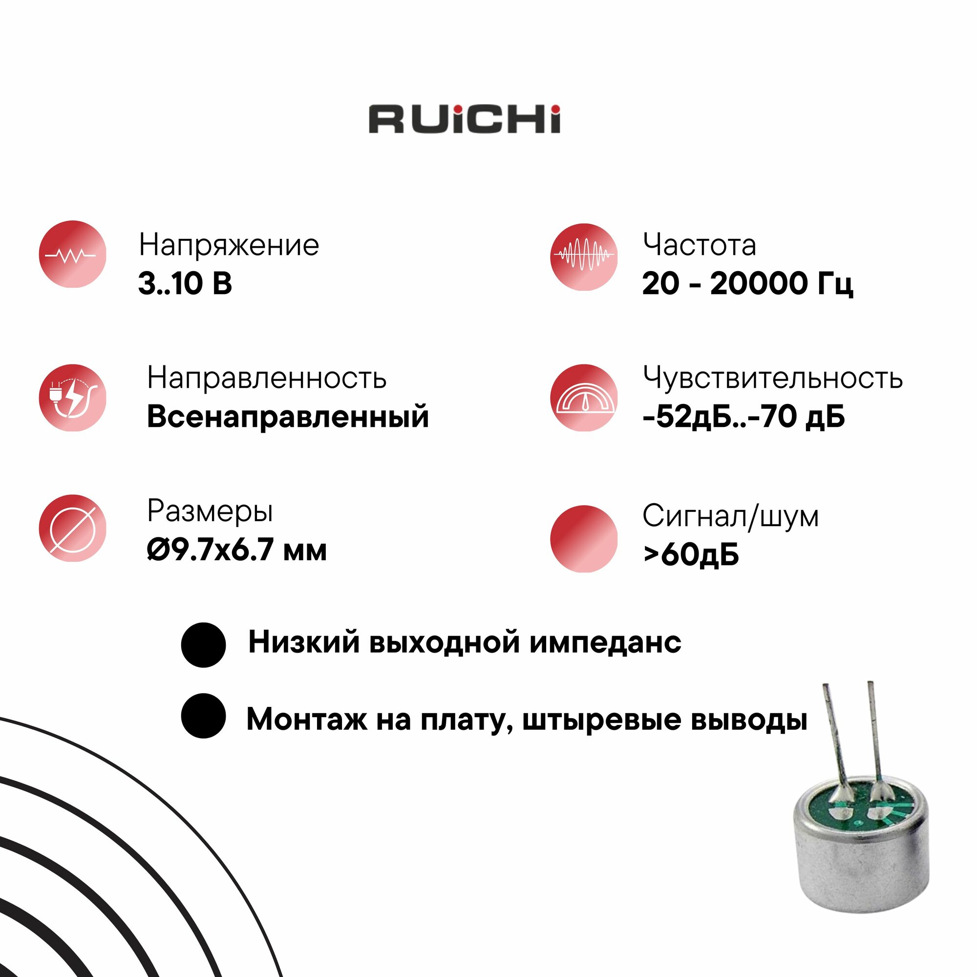 RUICHI Микрофон электретный всенаправленный ECM-4F- P , 9.7x6.7 мм, -52дБ.-70 дБ, 3.10 В, 20 - 20000 Гц, 10 шт информация: