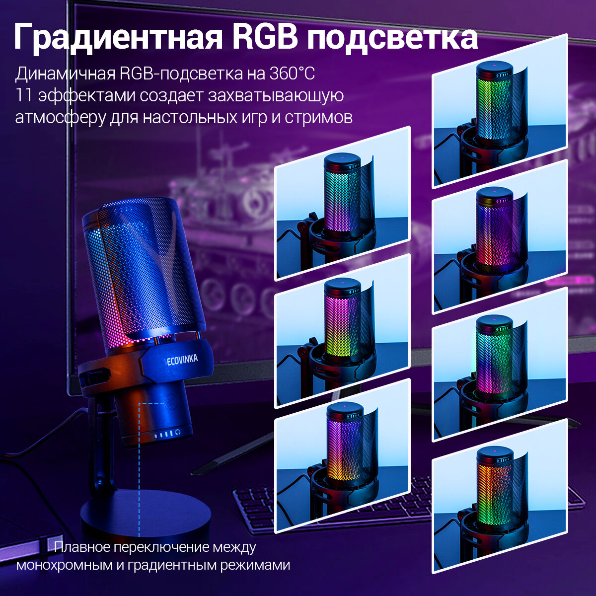 Микрофон для для компьютера игровой ECOVINKA GM7 PRO, RGB-подсветкой, Совместим с монитором ECONINKA FT27A Pro информация: