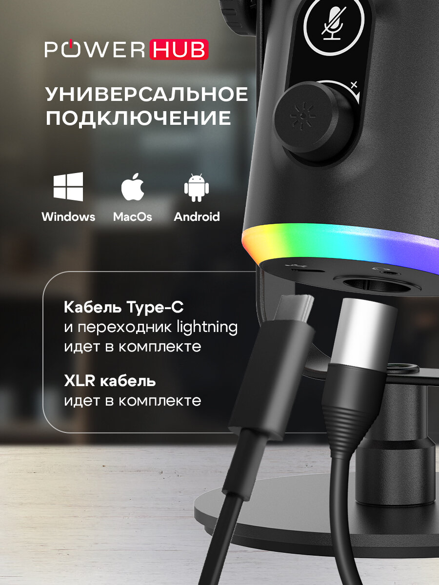 Микрофон студийный игровой чёрный для ПК/iPhone/Android с RGB-подсветкой информация: