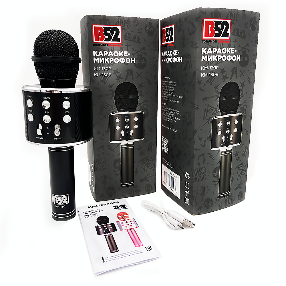 10 цен на Караоке-микрофон B52 KM-130B, 3Вт, АКБ 800 мА/ч, ВТ (до 10м), USB, беспров. микрофон