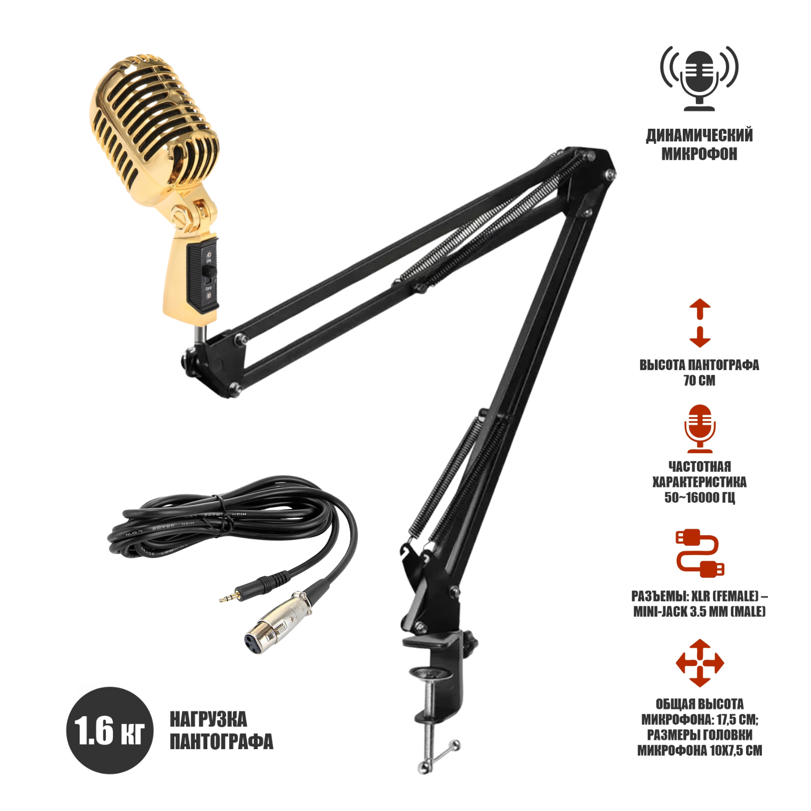 Отзывы на Микрофон винтажный золотой, кабель 2.5 м XLR (female) – mini-jack 3.5 mm (male), на пантографе ST с усиленной струбциной