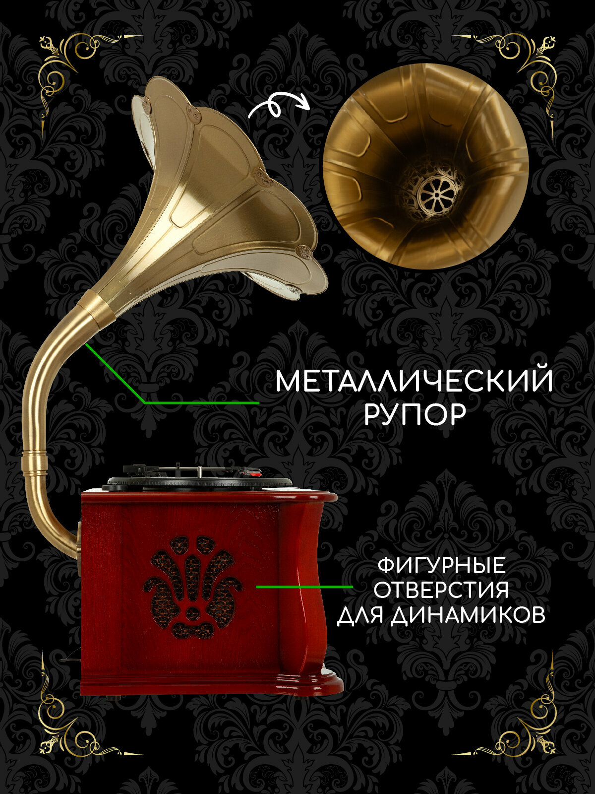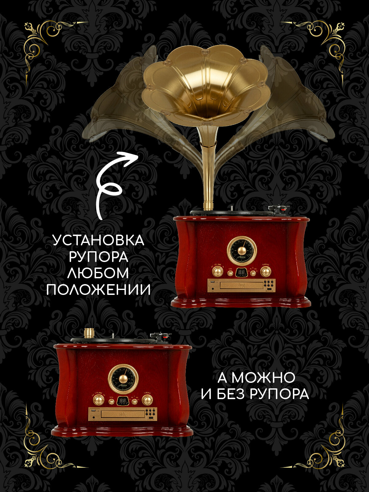 Виниловый проигрыватель с металлической трубой Audio-Retro MI1906CD, радиоприёмник FM, CD, USB разъёмы, Bluetooth