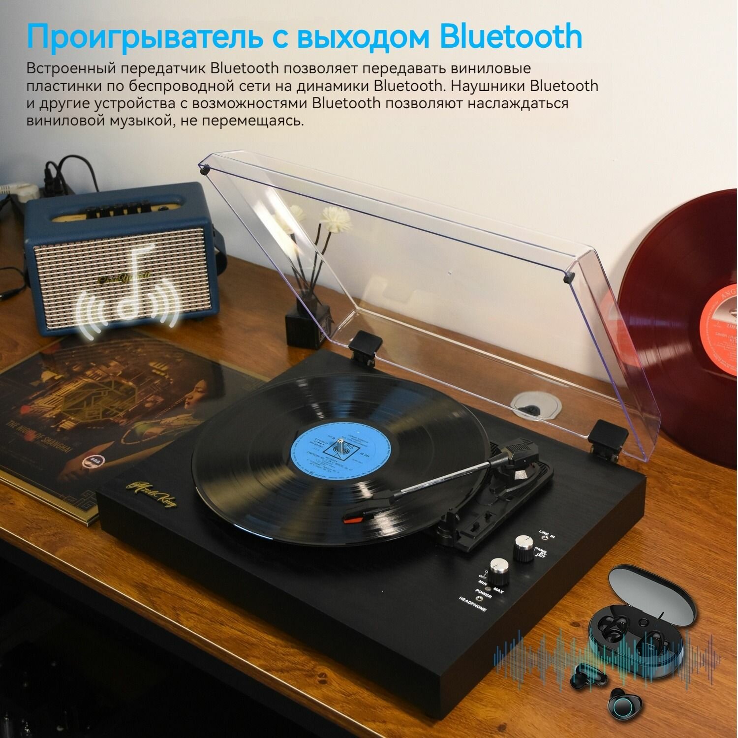 Проигрыватель виниловых дисков oneZ, Bluetooth 5,0, пылезащитная крышка информация: