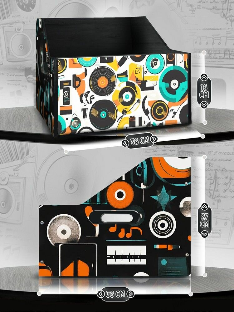 Подставка (ящик, органайзер) для хранения виниловых пластинок с принтом "Музыка Винил (Диски, пластинки, паттерн) - 62503390" информация: