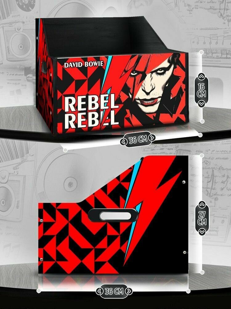 10 цен на Подставка (ящик, органайзер) для хранения виниловых пластинок с принтом "музыка David Bowie (Дэвид Боуи, Rebel rebel, арт-поп, глэм-рок, нью вейв) - 52503244"