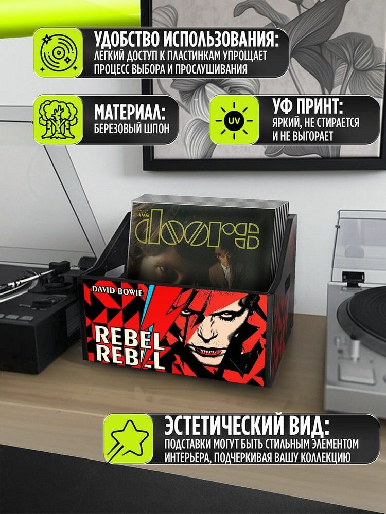 Отзывы на Подставка (ящик, органайзер) для хранения виниловых пластинок с принтом "музыка David Bowie (Дэвид Боуи, Rebel rebel, арт-поп, глэм-рок, нью вейв) - 52503244"