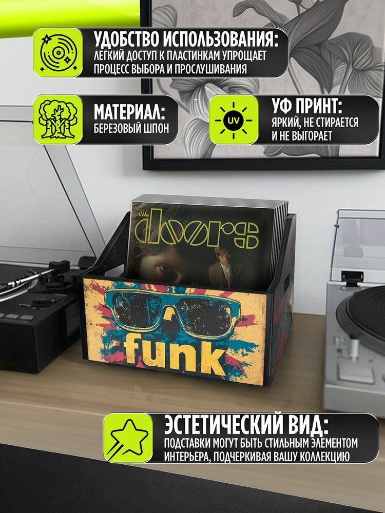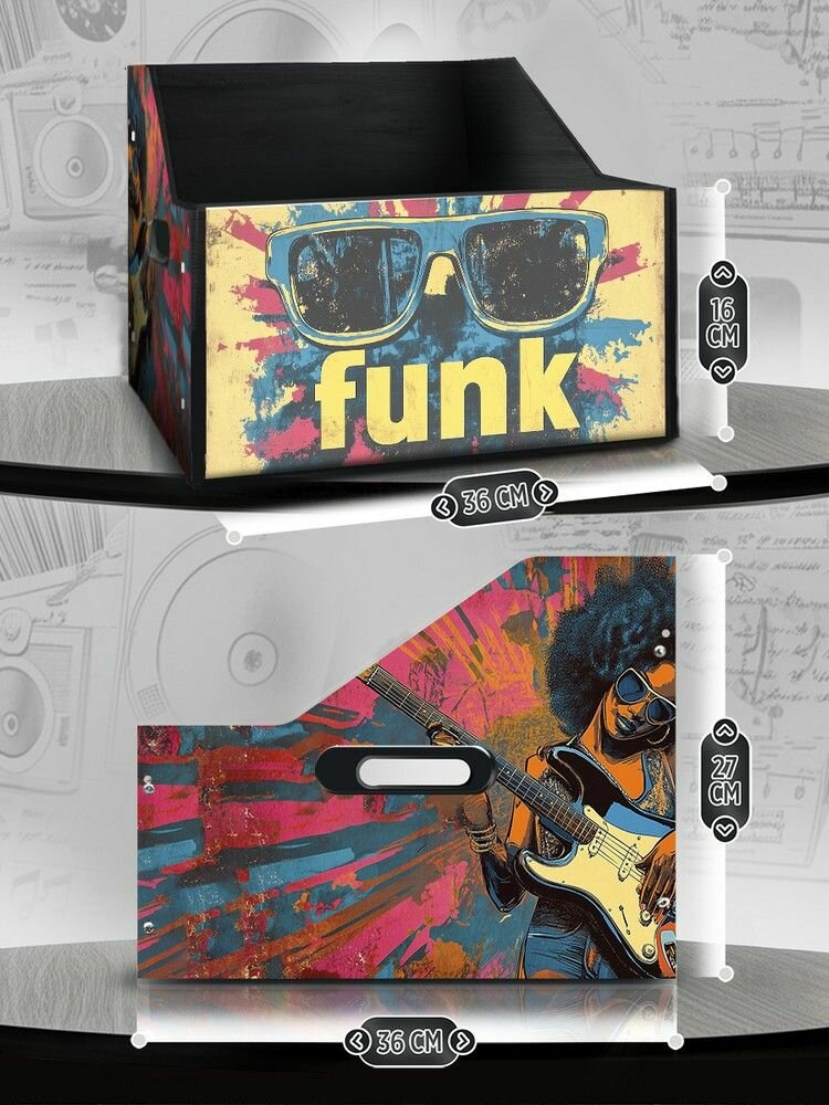 Подставка (ящик, органайзер) для хранения виниловых пластинок с принтом "Музыка Funk (джаз винтаж, ретро, диско, афро) - 4250312" информация: