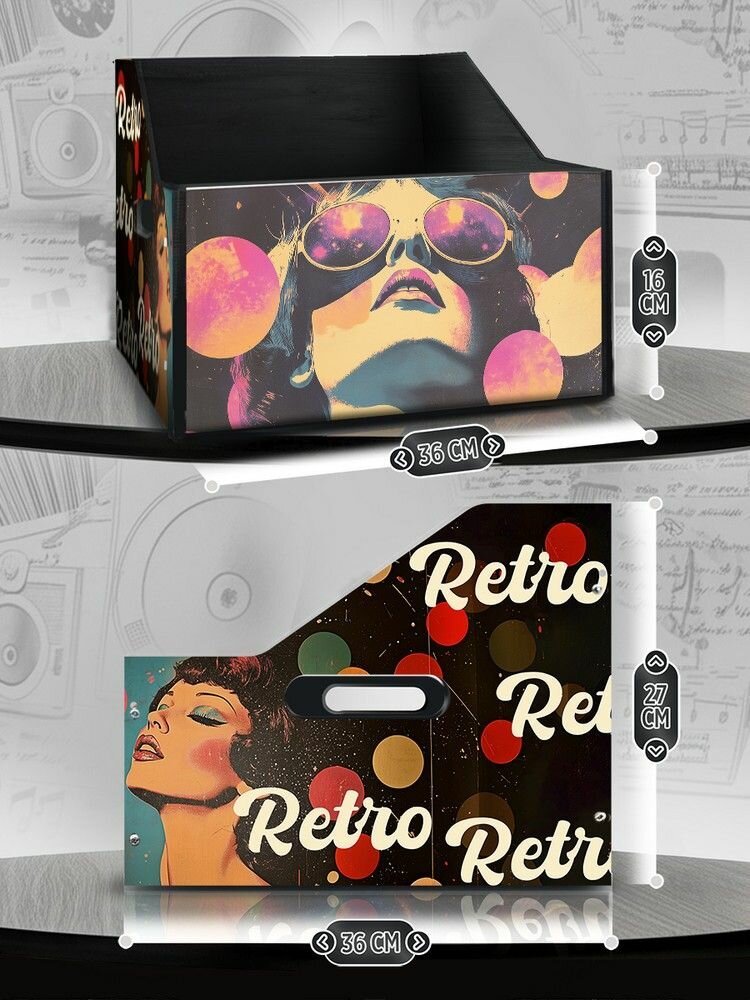 Подставка (ящик, органайзер) для хранения виниловых пластинок с принтом "Музыка очки (джаз винтаж, ретро, диско, плакат) - 4250323" информация: