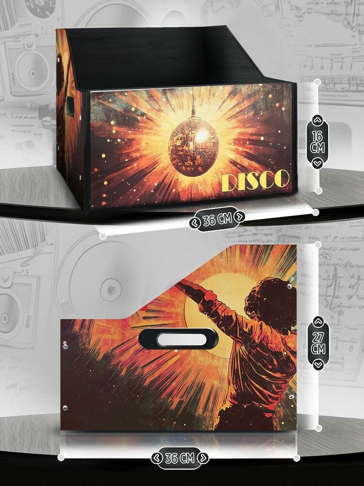 10 цен на Подставка (ящик, органайзер) для хранения виниловых пластинок с принтом "Музыка disco (джаз винтаж, ретро, диско, афро, funk диско шар) - 4250324"