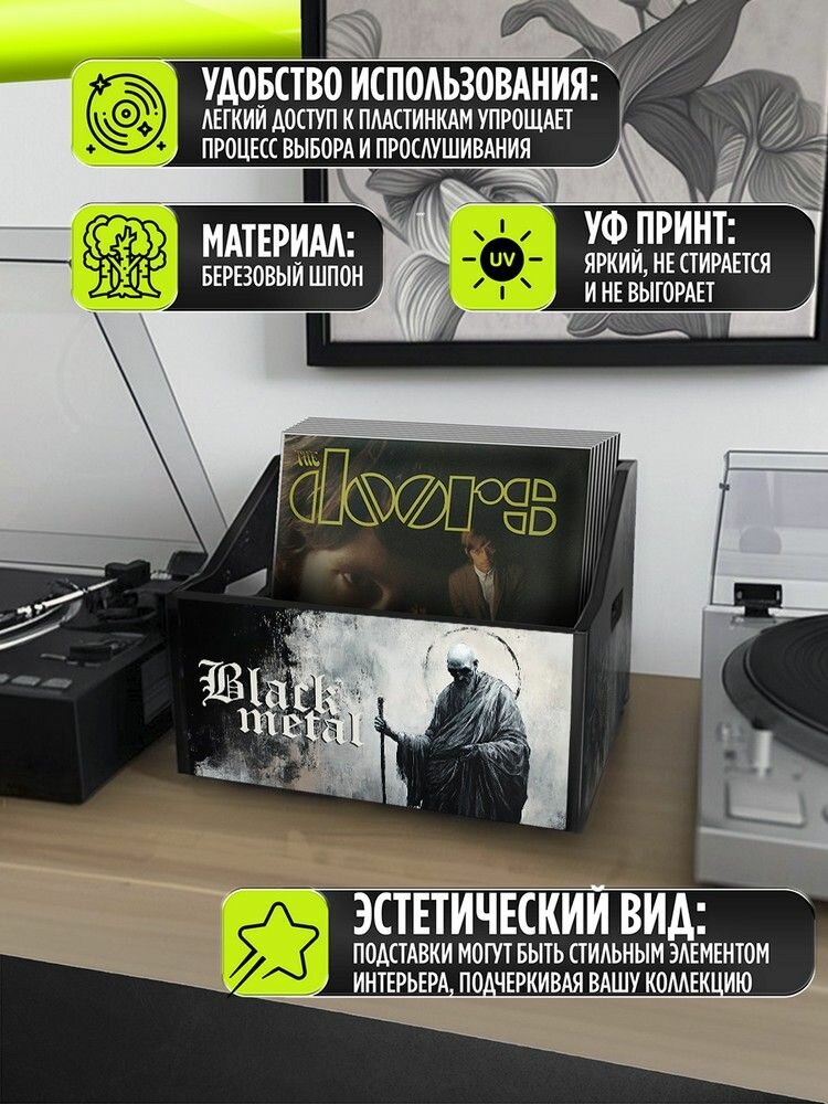 10 цен на Подставка (ящик, органайзер) для хранения виниловых пластинок с принтом "Музыка Black metal (Жанр, блэк метал, рок, мрачность, дарк, ворон, виниловая пластинка) - 6250443"