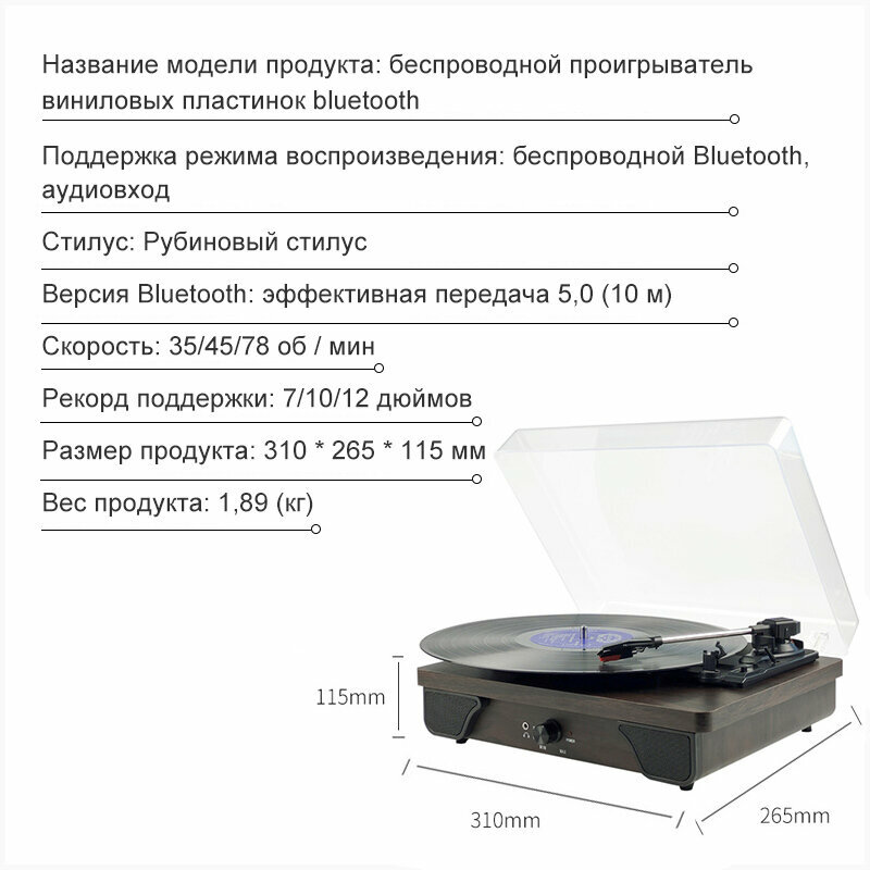 Проигрыватель винила Bluetooth "3", с динамиками и встроенным фонокорректором информация: