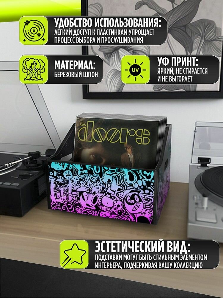 Подставка (ящик, органайзер) для хранения виниловых пластинок с принтом "эстетика Психоделика (сюр, мультяшки, кислота, символы, кот, кролик) - 52504010" 2 190 ₽