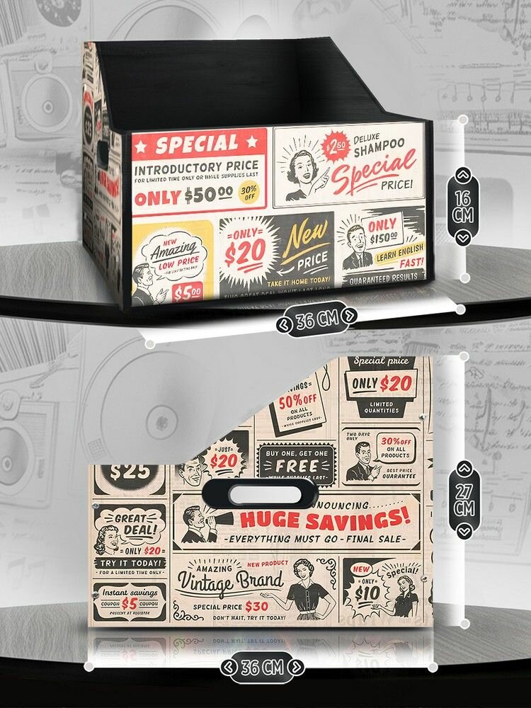Подставка (ящик, органайзер) для хранения виниловых пластинок с принтом "Эстетика Ретро (Газета, винтаж, виниловая пластинка) - 62503402" информация: