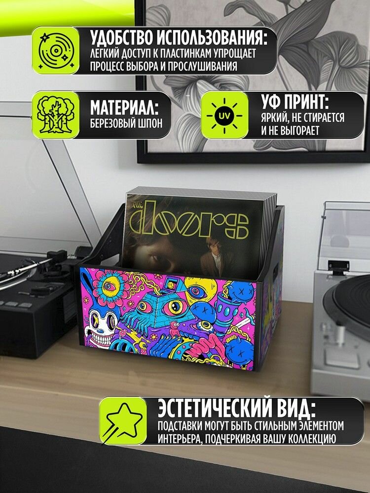 Отзывы на Подставка (ящик, органайзер) для хранения виниловых пластинок с принтом "эстетика Психоделика (сюр, мультяшки, кислота, символы, кот, кролик) - 52504010"
