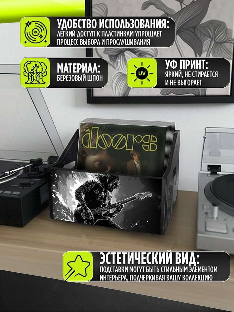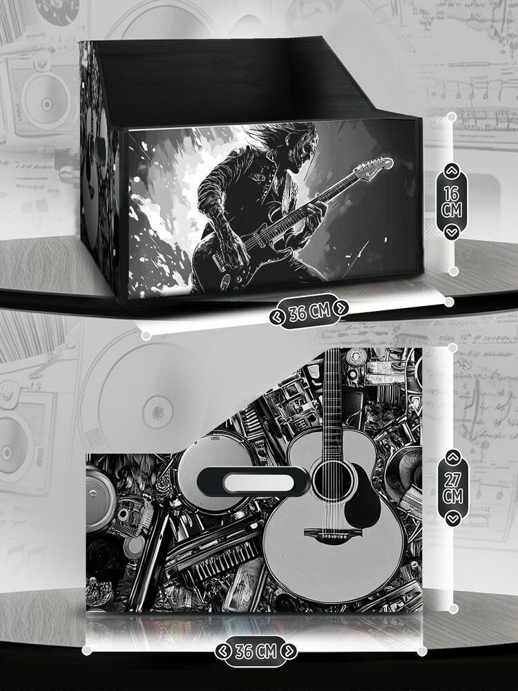 Подставка (ящик, органайзер) для хранения виниловых пластинок с принтом "Разное Музыка (Гитара, барабан, микрофон, рок, музыкант, виниловая пластинка) - 6250446" информация: