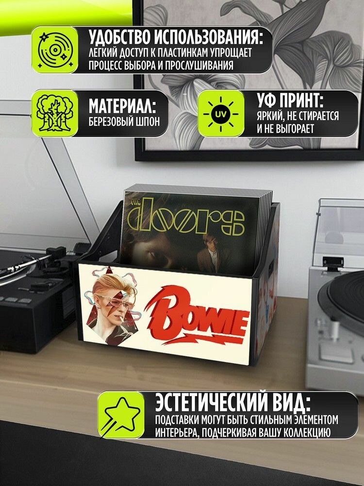 10 цен на Подставка (ящик, органайзер) для хранения виниловых пластинок с принтом "Разное Музыка (Девид Боуи, Dawid Bowie, гитара, винил) - 6250452"