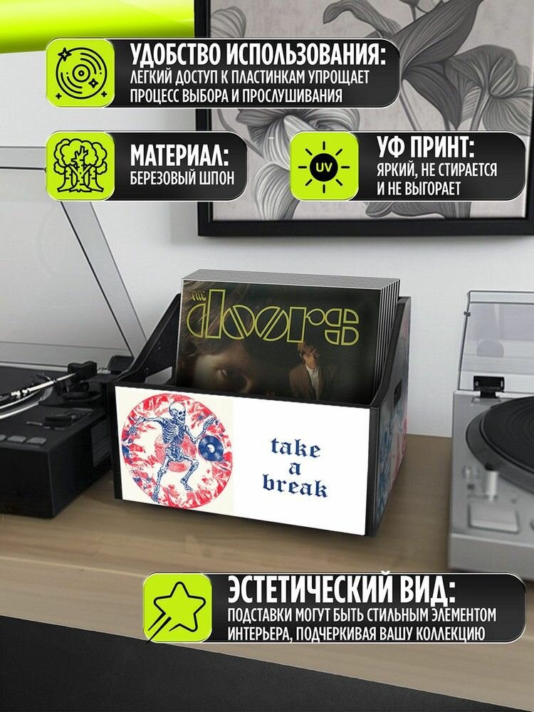 Отзывы на Подставка (ящик, органайзер) для хранения виниловых пластинок с принтом "Разное Иллюстрация (Череп, скелет, музыка, виниловая пластинка) - 6250444"