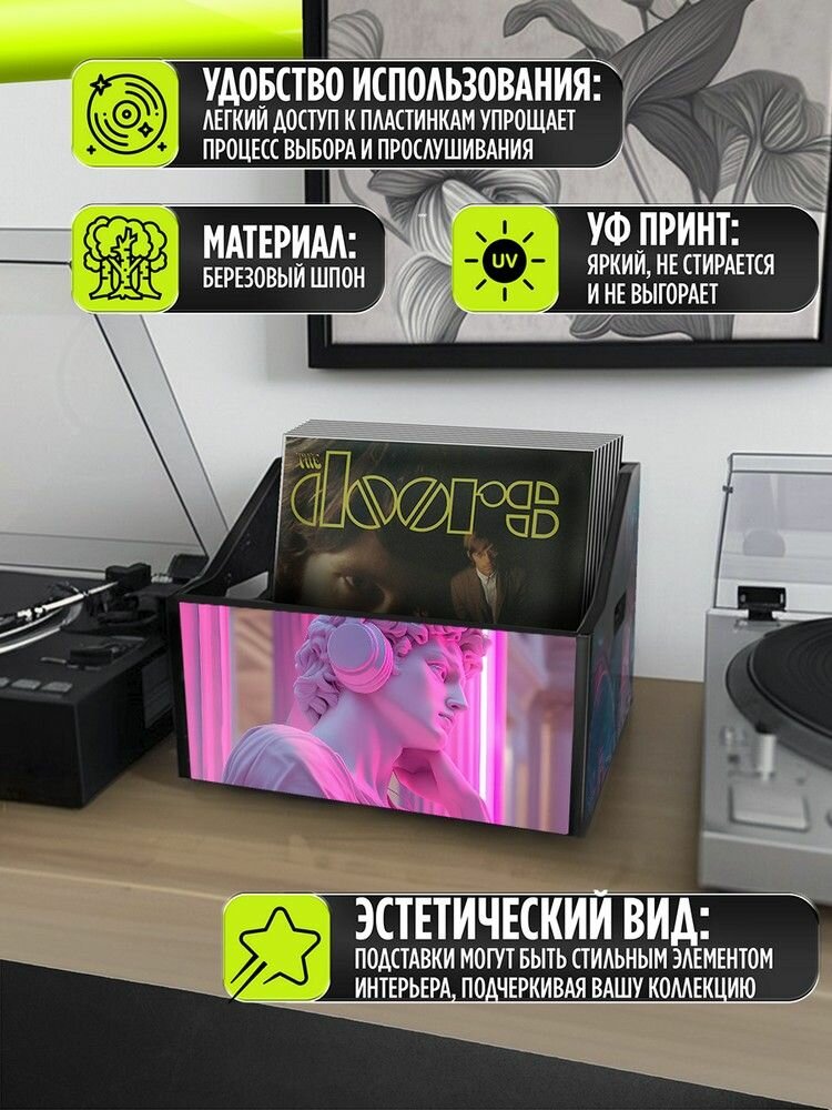 Отзывы на Подставка (ящик, органайзер) для хранения виниловых пластинок с принтом "Разное Искусство (Давид, статуя, наушники, виниловая пластинка) - 62503397"
