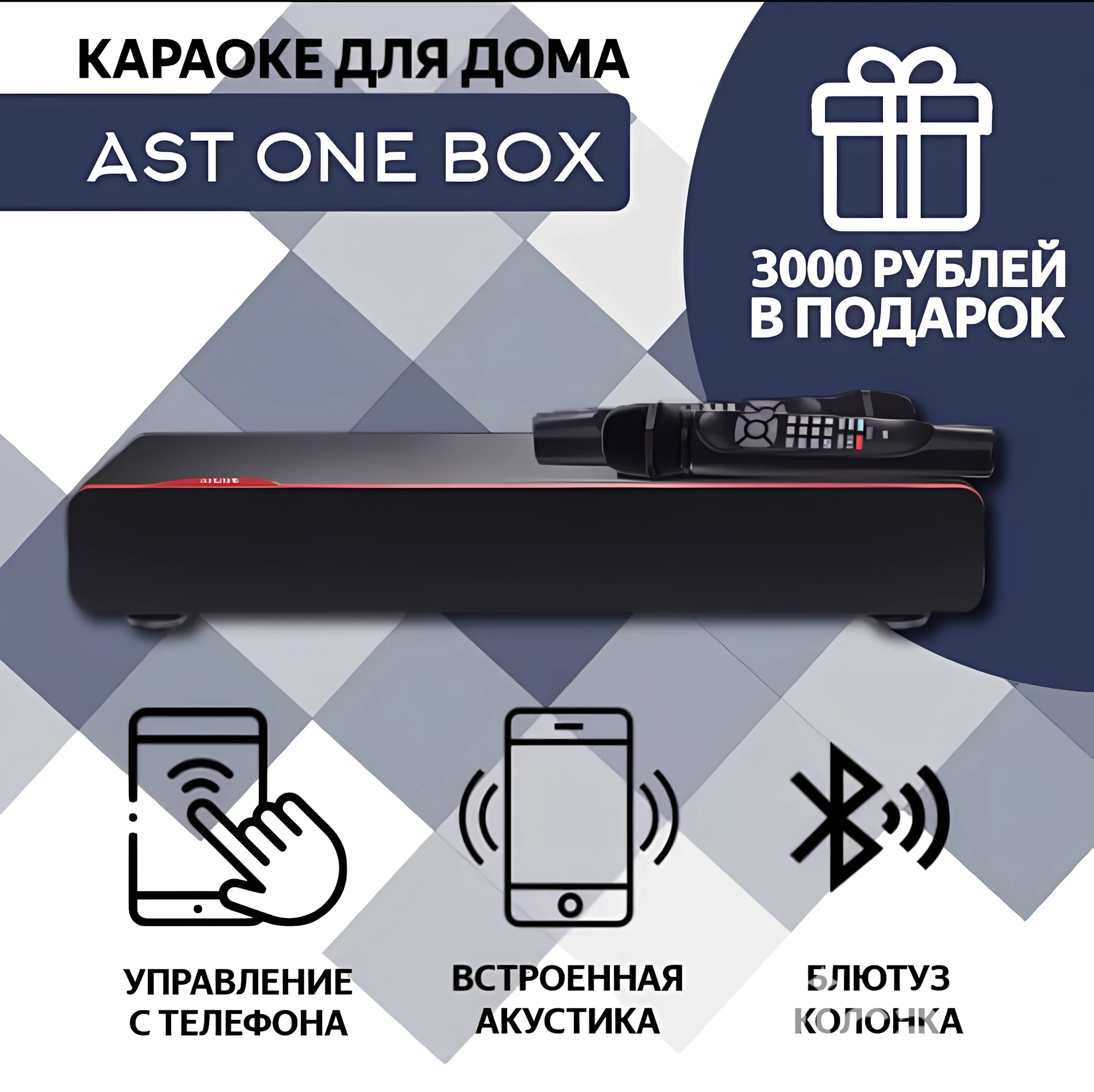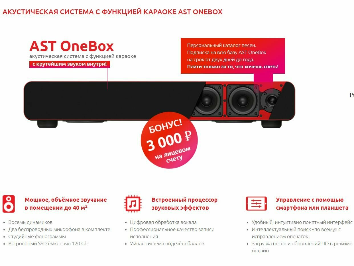 AST OneBox 4 в 1 это Профессиональный караоке аппарат, блютуз колонка, сабвуфер, микрофоны, 3000 рублей в подарок информация: