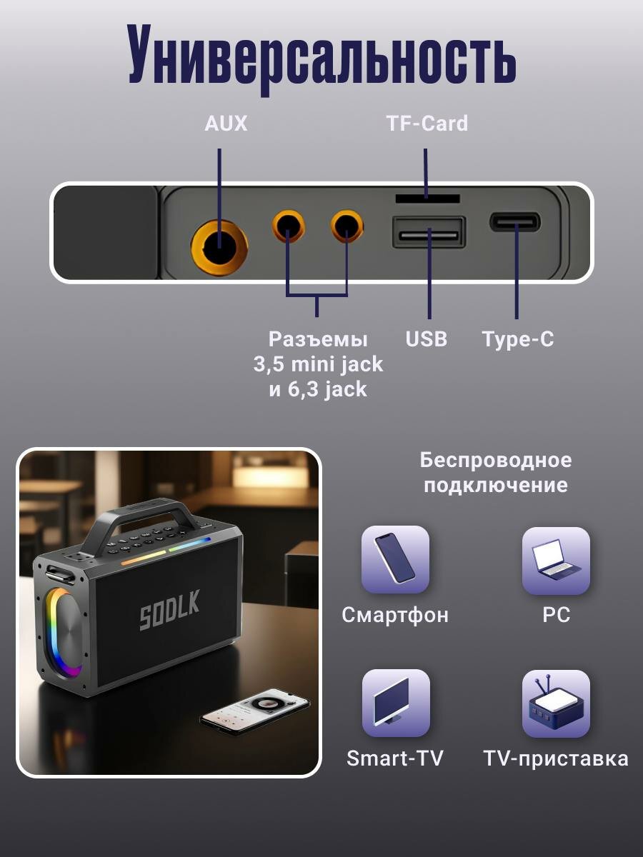 Караоке- система SODLK S1115 200W BLUETOOTH аккумуляторная с двумя беспроводными микрофонами информация: