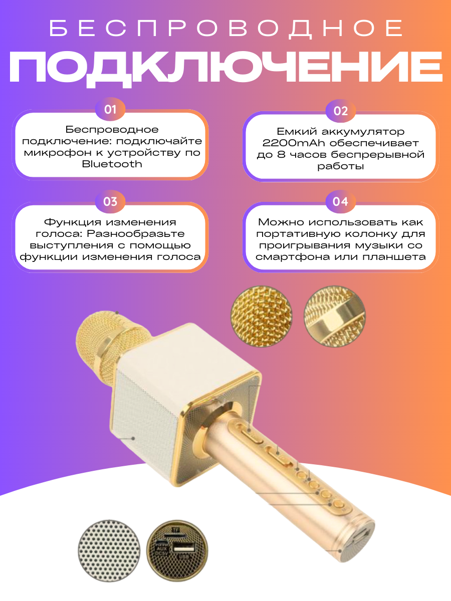 Караоке-микрофон Bluetooth, 2 предустановленные песни, портативный, золотистый информация: