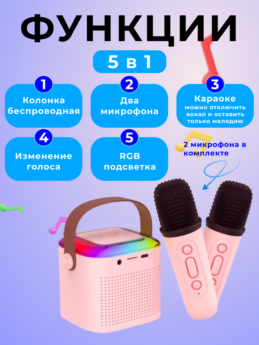 Детское беспроводное караоке с двумя микрофонами и колонкой, с RGB-подсветкой, цвет розовый информация: