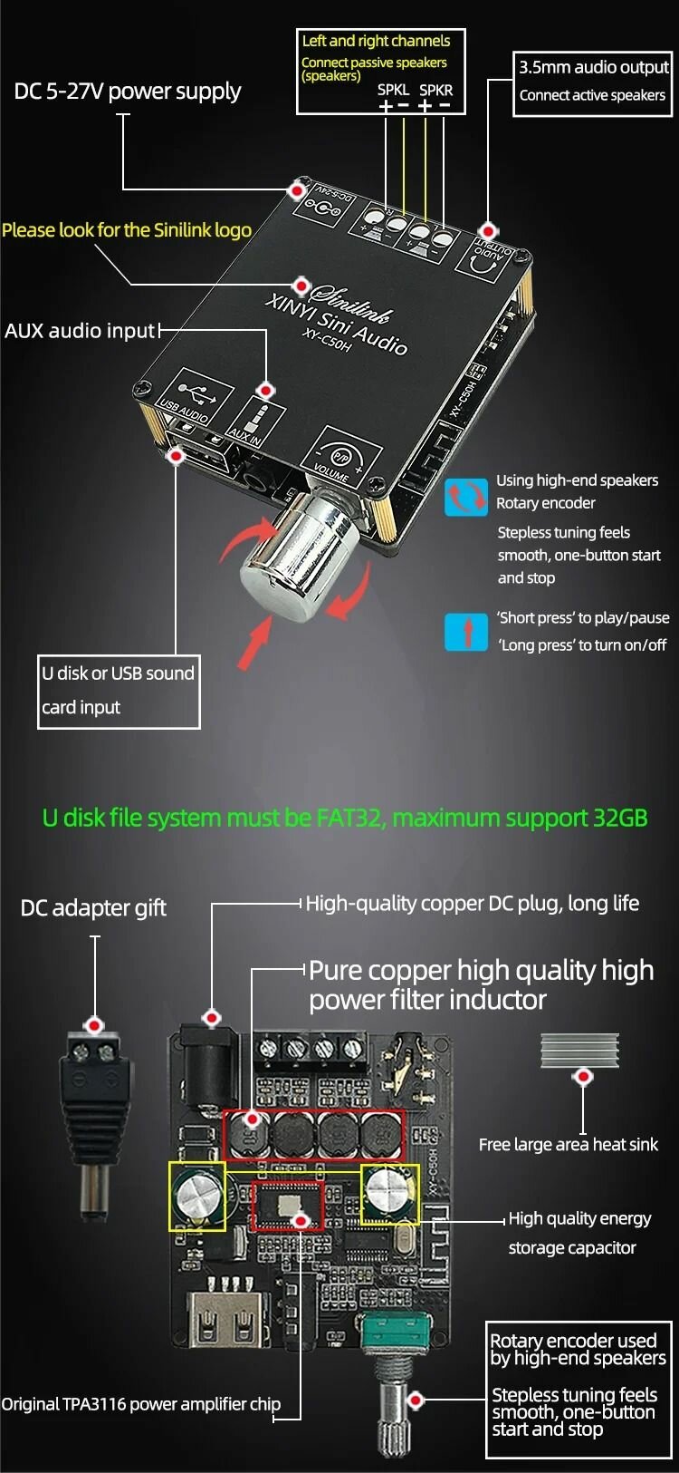 Усилитель мощности звука с Bluetooth 5.0 XY-С50H 50WX2 TPA3116D2, Цифровой усилитель звука колонок, пассивной акустики информация:
