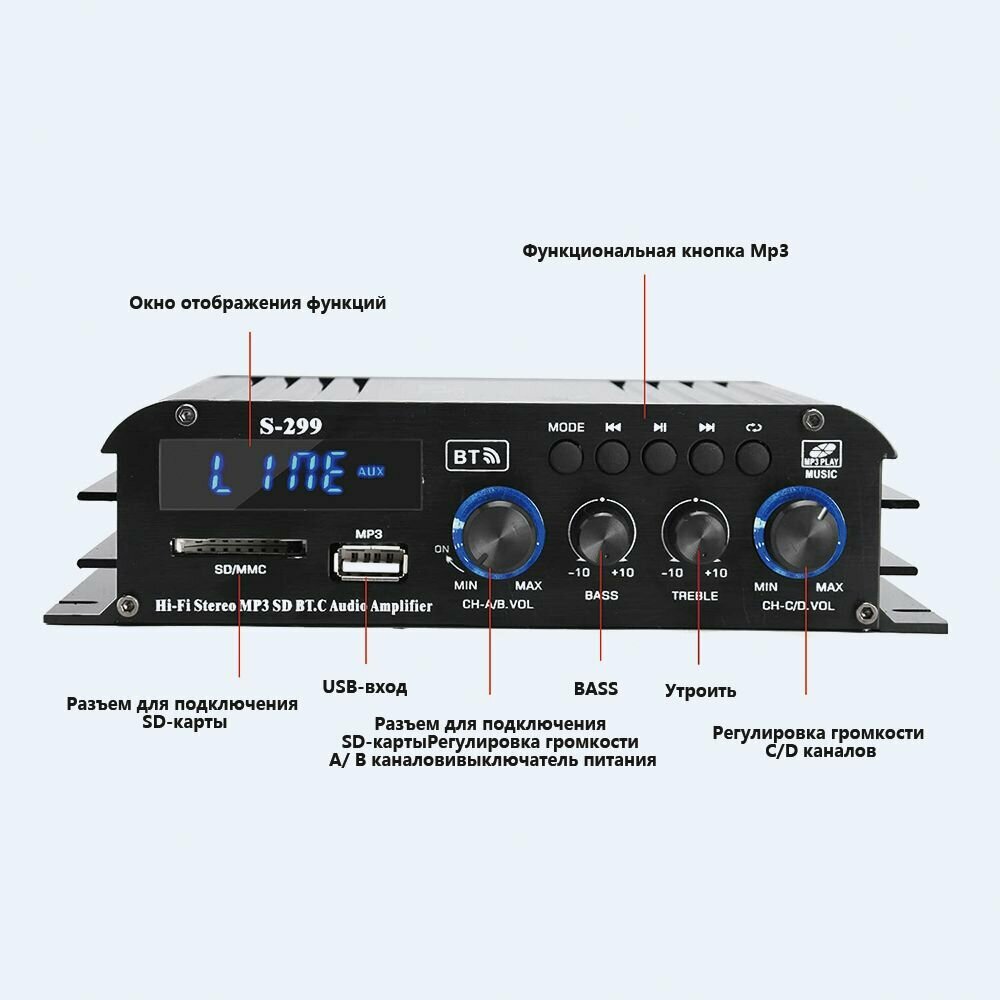 Усилитель звука для колонок, S299, усилитель для колонок, Bluetooth 5.0,4.1канала, интерфейс RCA/USB/SD,160BT*4 информация: