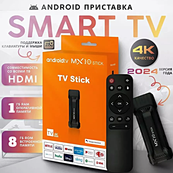 Медиаплеер ТВ-приставка Android MX10 TV Stick Wi Fi без голосового набора, Android, 1ГБ/8ГБ, Bluetooth, Wi-Fi, Черный информация: