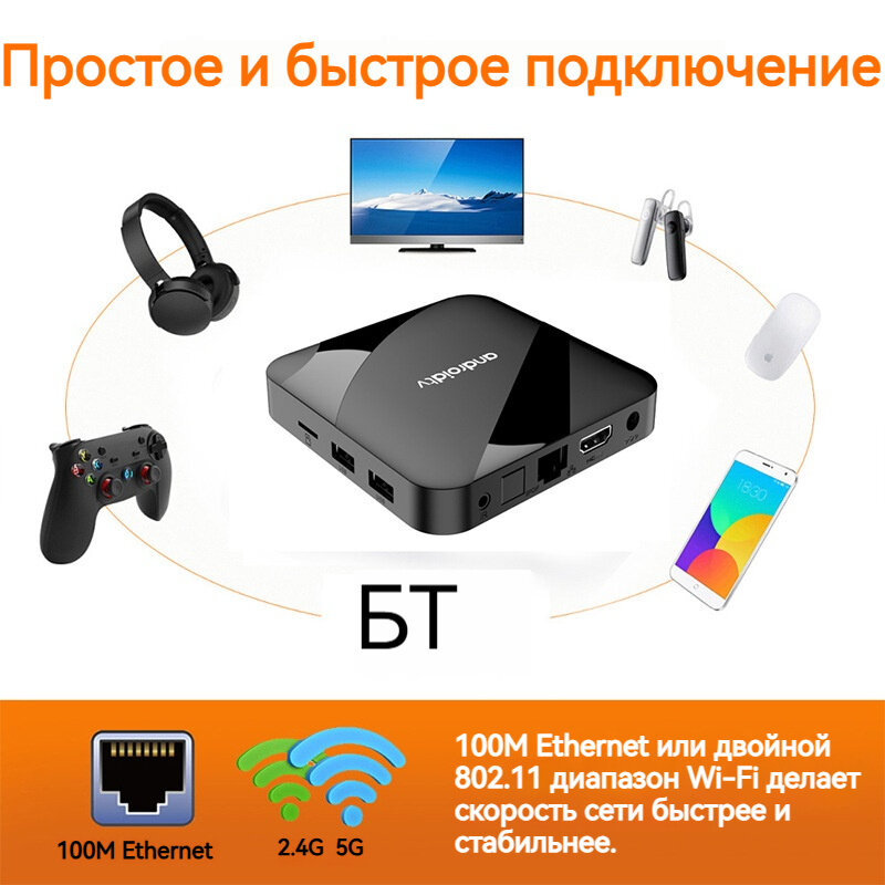 Смарт ТВ приставка 4ГБ/64ГБ, Android 14, высокое разрешение 3840x2160, Google Assistant, WiFi 2,4G/5G для дома и семьи информация: