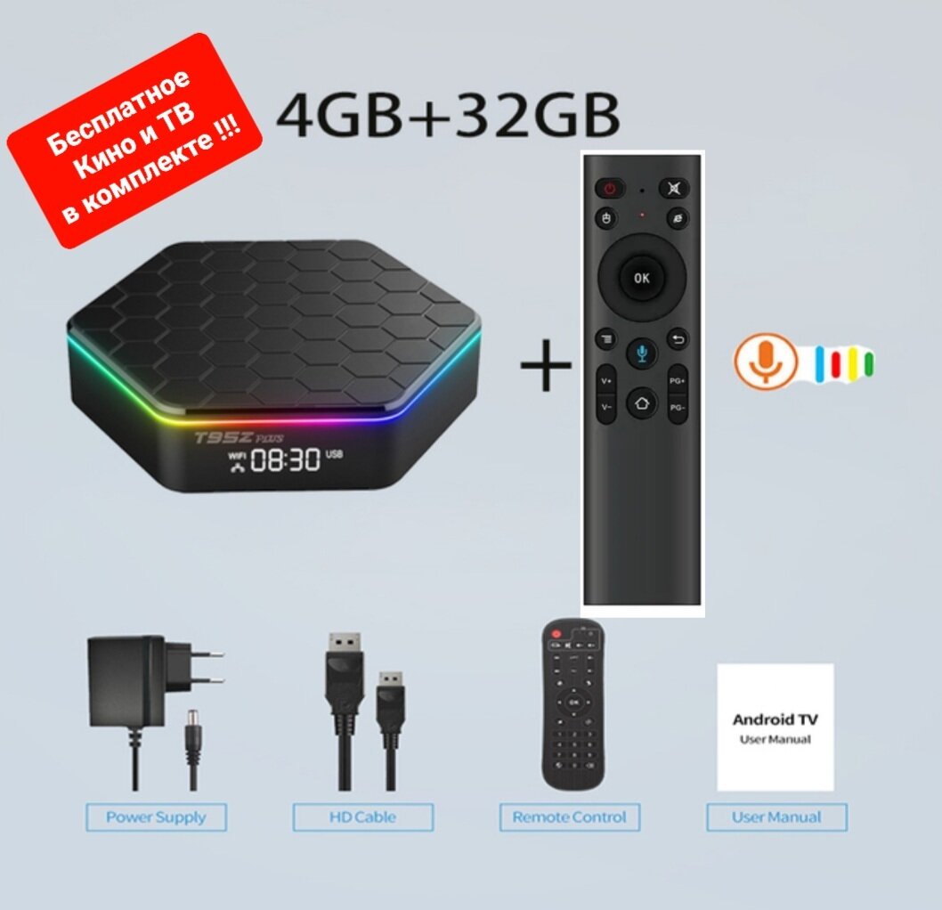 Смарт ТВ бокс T95Z Plus H618 Андроид 12 Wi-Fi 6 подсветка + Аэропульт Q5 Bluetooth голосовым управлением информация: