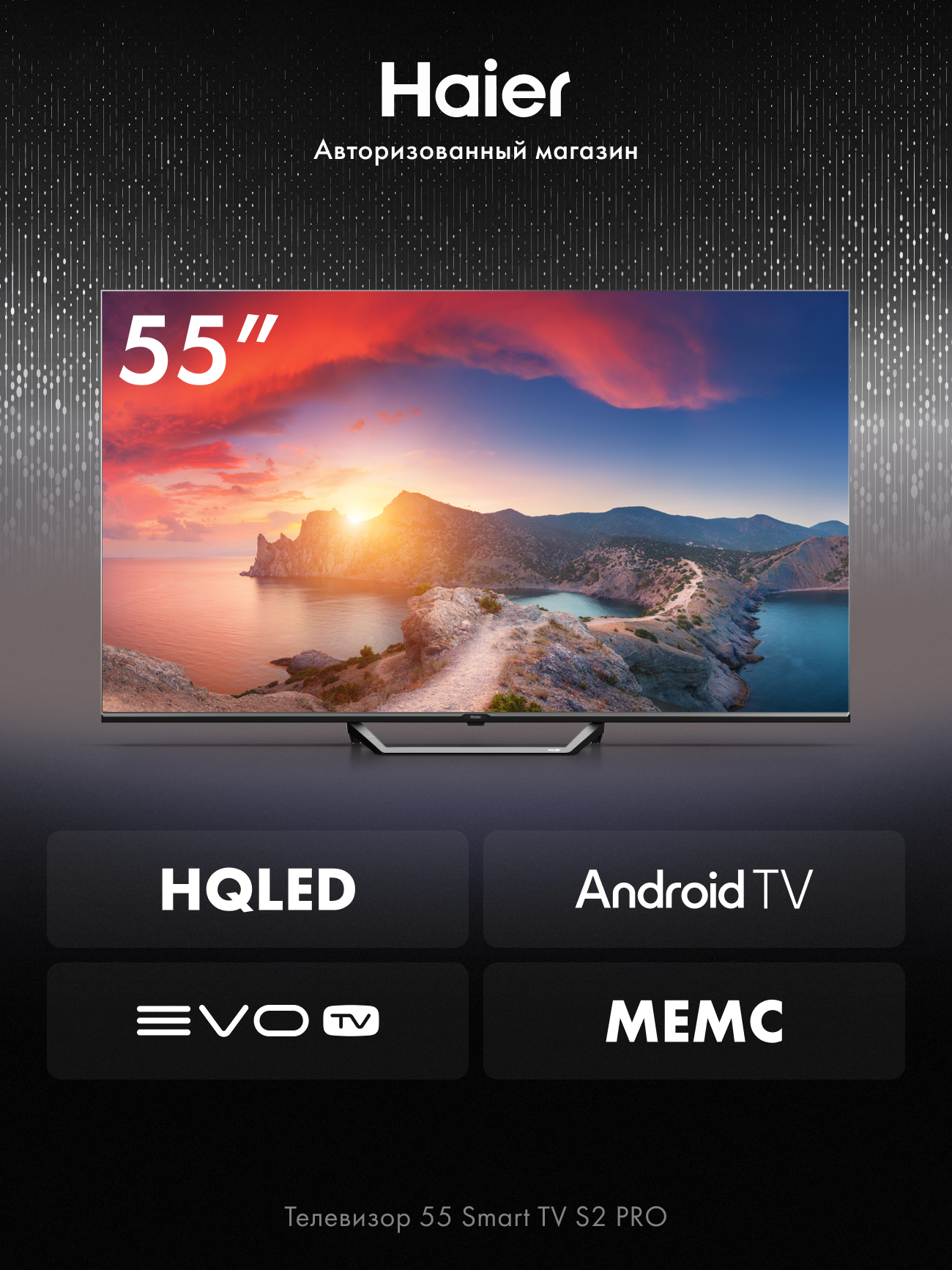Телевизор Haier 55 Smart TV S2 Pro, 55", 4K, Android TV, EVO TV, Dolby Digital, Wi-Fi 5ГГц, HDR 10, Upscaling 4K, 60 Гц информация: