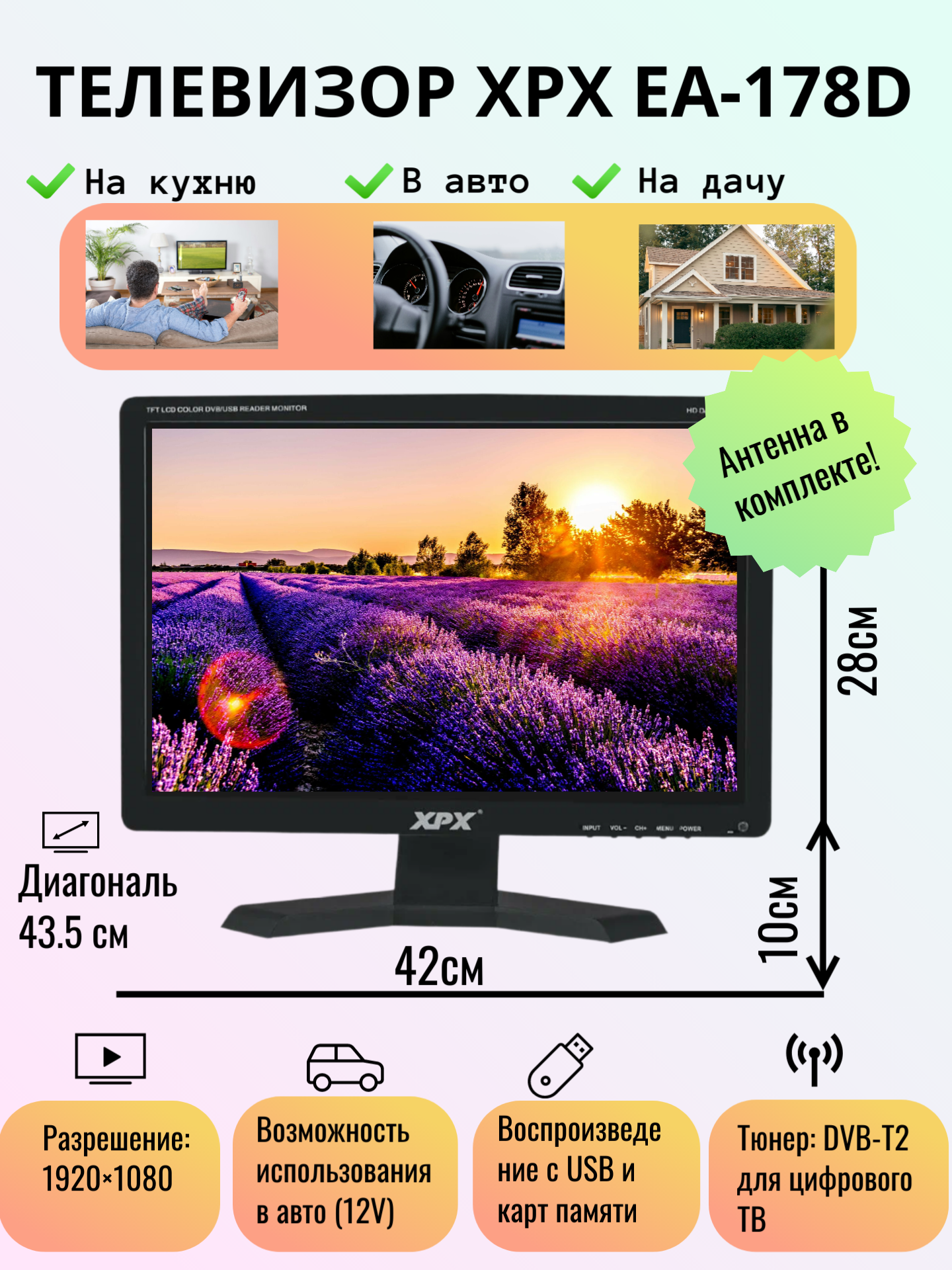 Телевизор Xpx EA-178D DVB-T2 18" (1920x1080) информация: