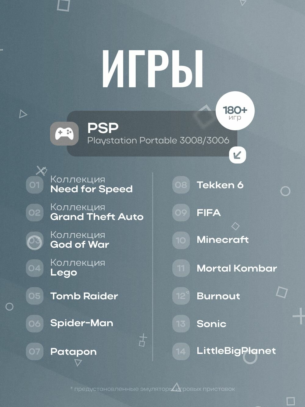 0 отзывов, средняя оценка 0. Чтобы купить «Новые игровые консоли Sony PSP 3008 Slim Black Wi-Fi 128Gb/700 Игр» по лучшей цене мы сканируем авито, алиэкспресс, маркет, озон, савеловский, плеер, горбушку, беру, официальные сайты и находим минимальную. Администрация не несет ответсвенность актуальность цен на Новые игровые консоли Sony PSP 3008 Slim Black Wi-Fi 128Gb/700 Игр, более подробно узнавайте на сайте магазина.