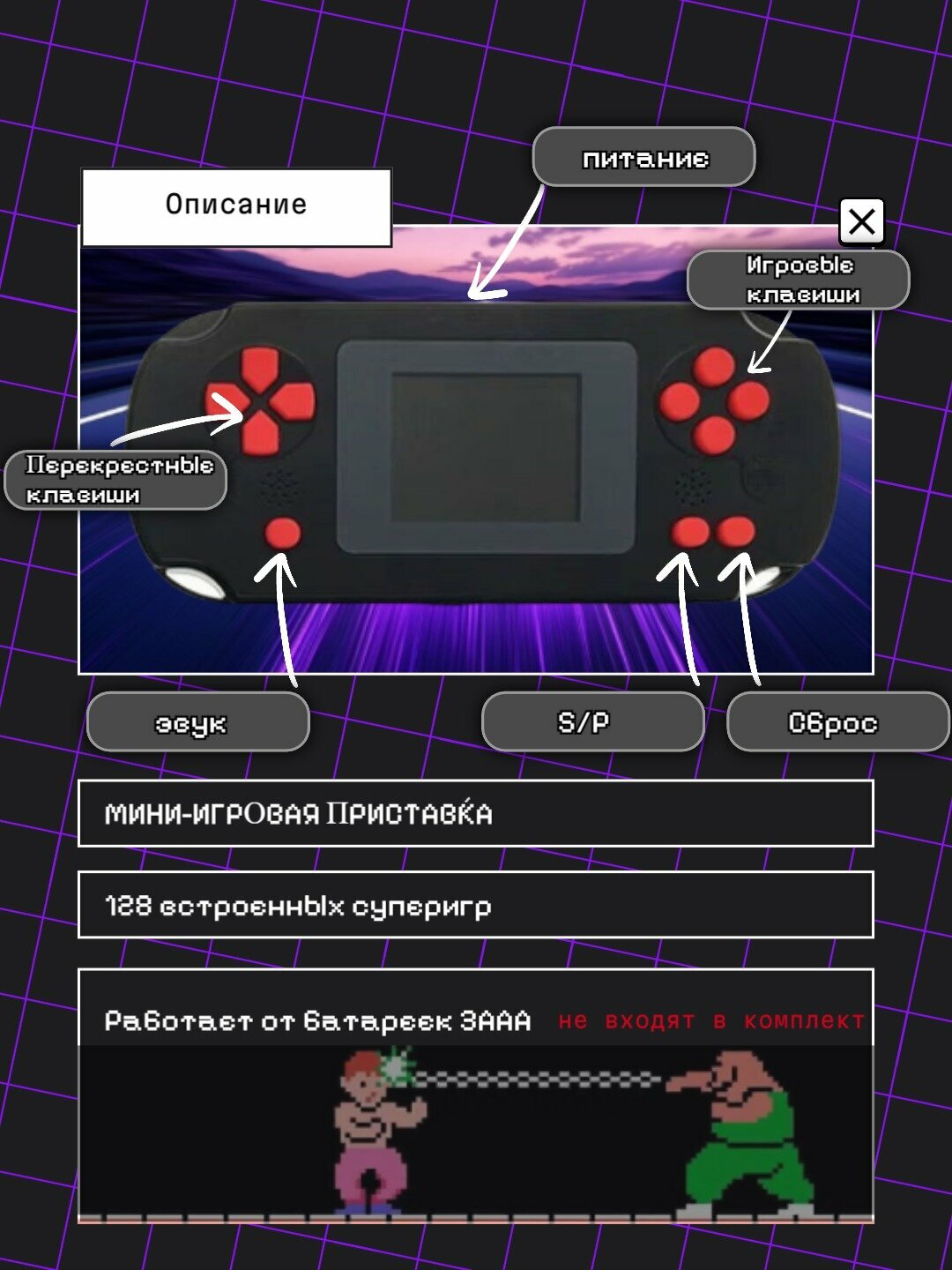 0 отзывов, средняя оценка 0. Чтобы купить «Игровая консоль, 128 встроенных игр, TFT-экран, портативная, черная» по лучшей цене мы сканируем авито, алиэкспресс, маркет, озон, савеловский, плеер, горбушку, беру, официальные сайты и находим минимальную. Администрация не несет ответсвенность актуальность цен на Игровая консоль, 128 встроенных игр, TFT-экран, портативная, черная, более подробно узнавайте на сайте магазина.