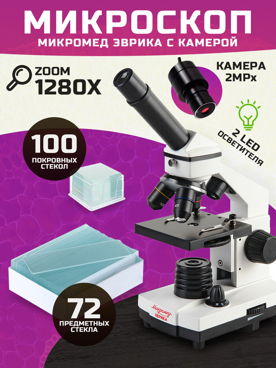 10 цен на Микроскоп Микромед "Эврика" 40x-1280x, с видеоокуляром, в кейсе и набором предметных и покровных стекл
