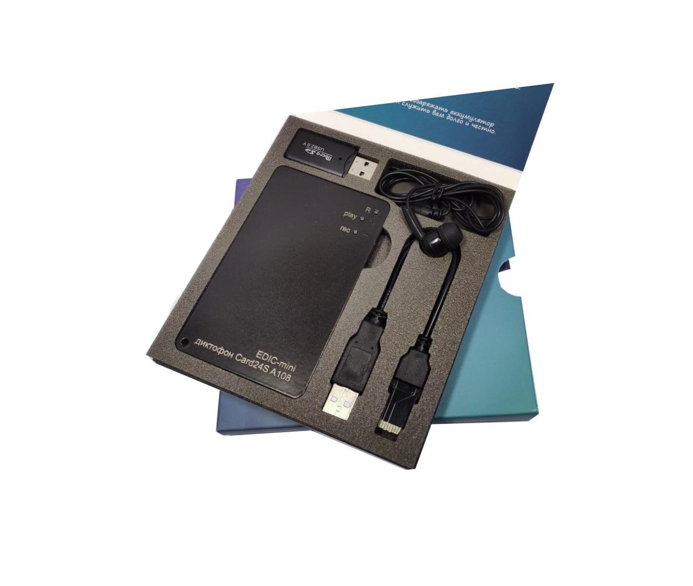 Мини диктофон визитка Edic-мини A108 (microSD) (Q20735EDI) + подарки (microSD и Power Bank) - запись до 20 метров, автономная работа до 600 часов - информация: