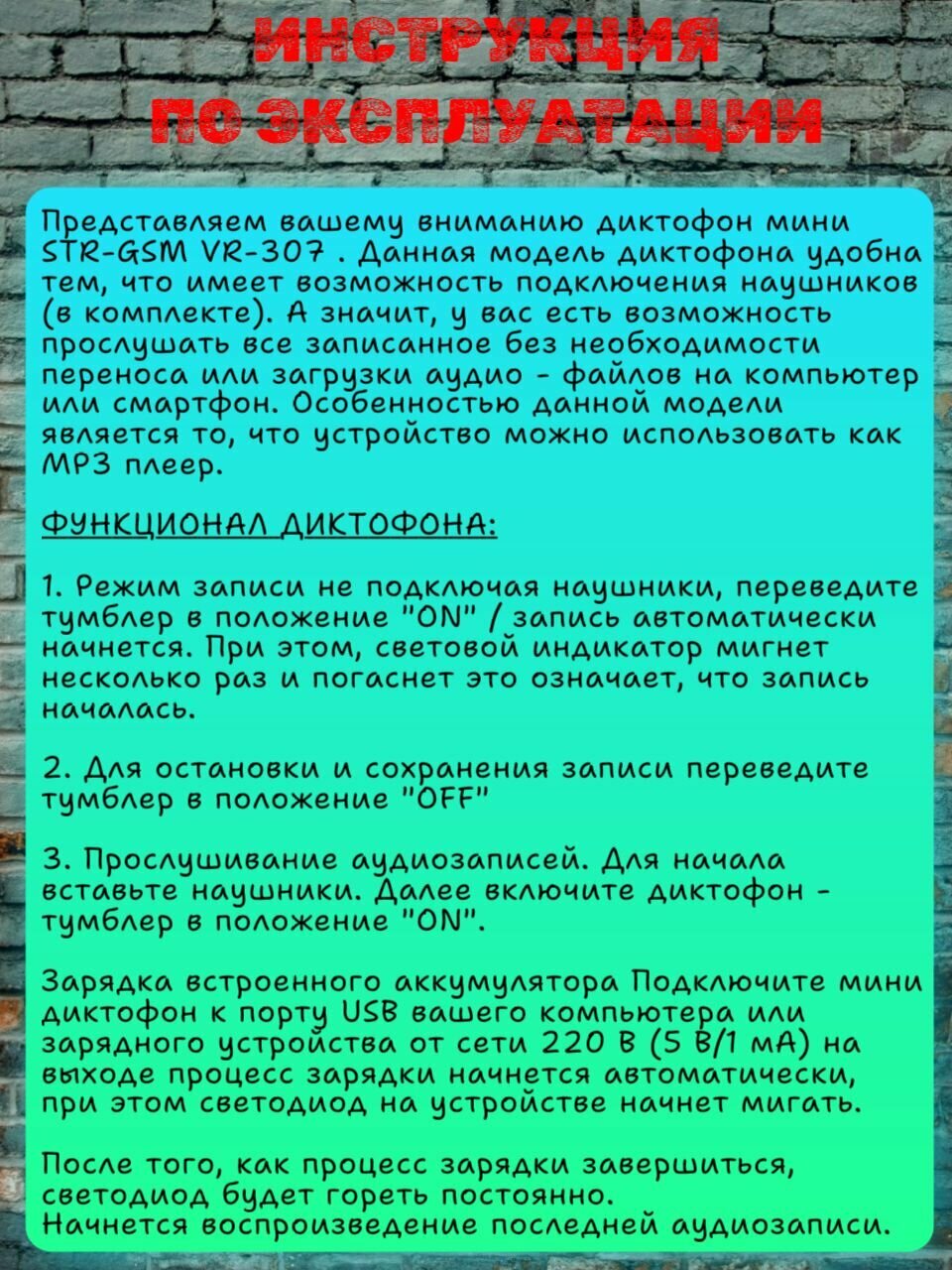 Портативный диктофон STR-GSM VR-307 (16Гб.) информация: