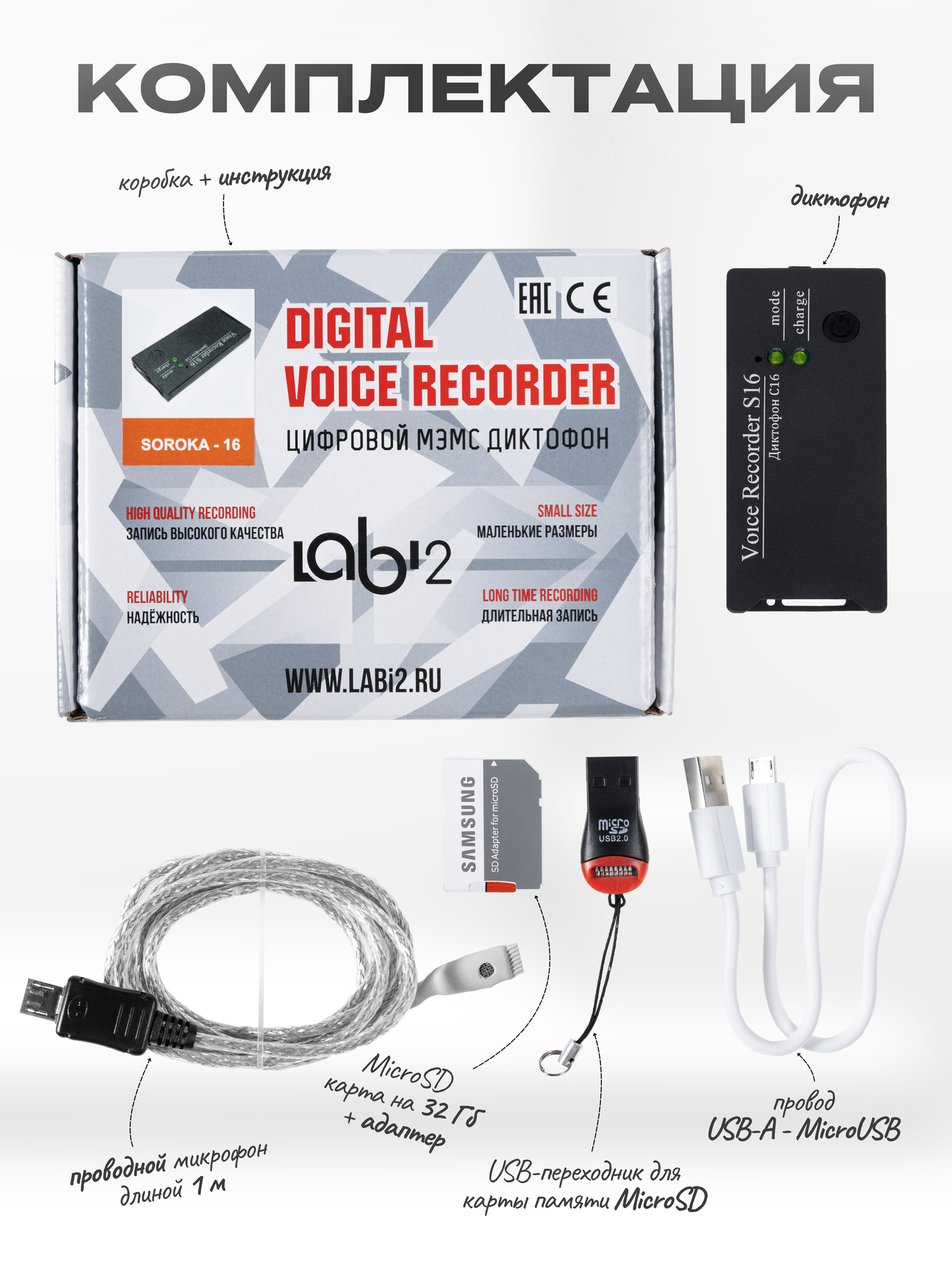 Мини диктофон Сорока 16.1 + внешний микрофон 1 метр для записи информация: