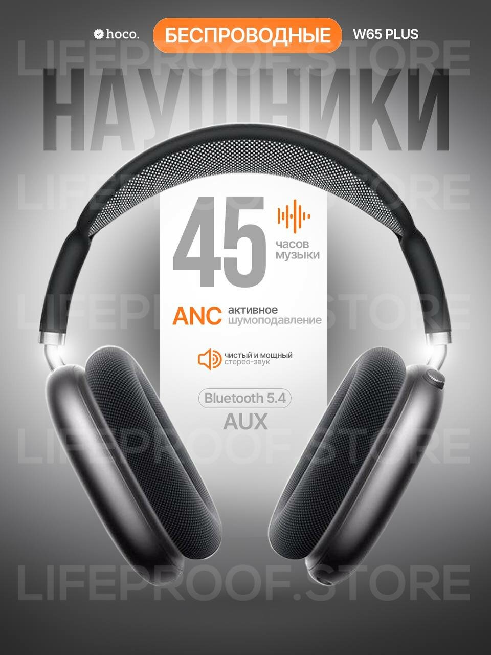 Беспроводные наушники с шумоподавлением Hoco W65 Plus с аккумулятором на 45 часов, BT 5.4, цвет Черно-серый информация: