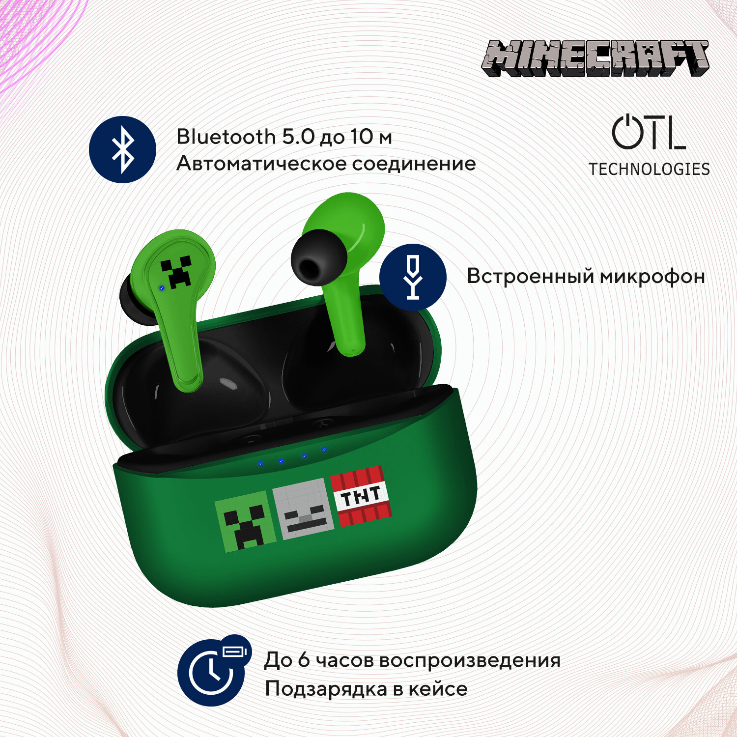 Наушники OTL Technologies "Minecraft Creeper", Bluetooth 5.0, внутриканальные информация: