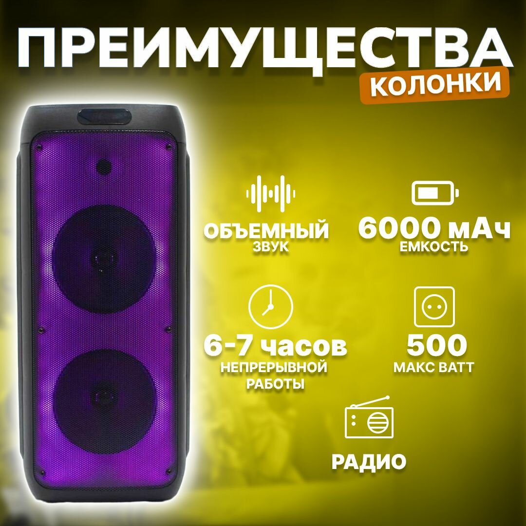 Умная Беспроводная Портативная Колонка 500 ватт с поддержкой Bluetooth, AUX, FM, микрофоном и пультом ДУ информация: