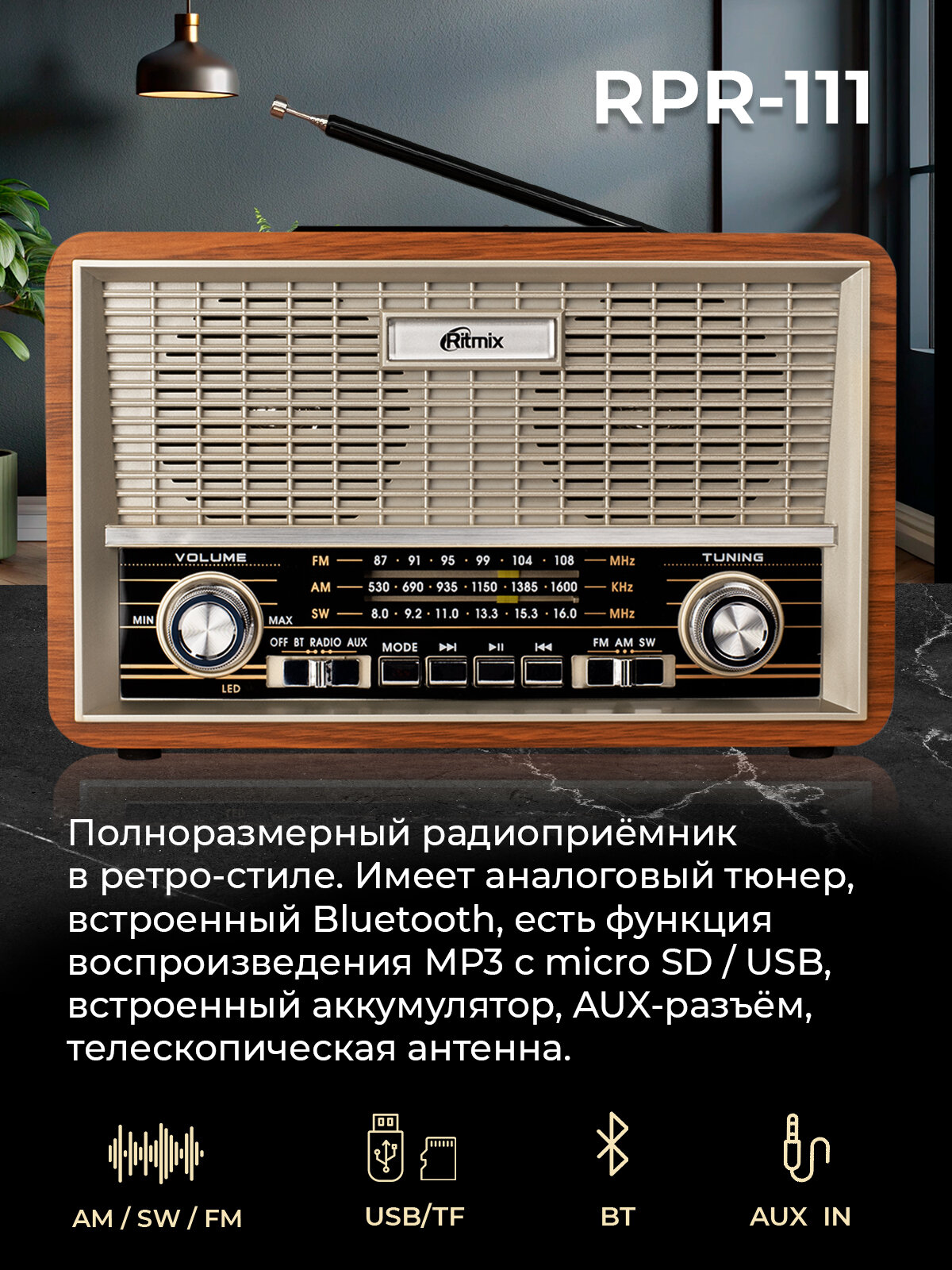 Радиоприемник RITMIX RPR-111 WOOD (FM/AM/SW), Bluetooth, USB, micro SD информация: