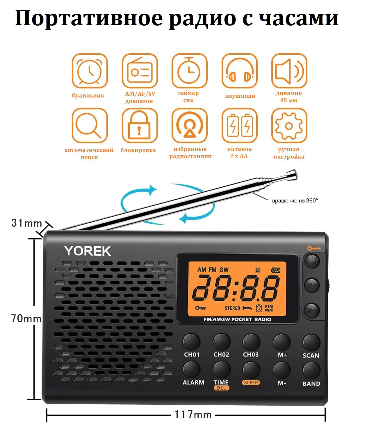 Портативный радиоприемник YK-M03, Диапазоны FM, MW, SW, DSP-процессор, Карманный, с Часами, Питание от Батареек 2*AA информация: