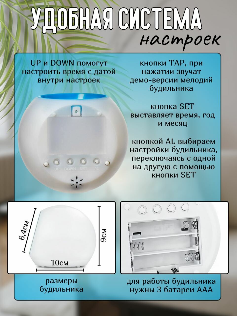 10 цен на Будильник "Шар" со сменой цветов / Настольные музыкальные цифровые часы с разноцветной подсветкой синие