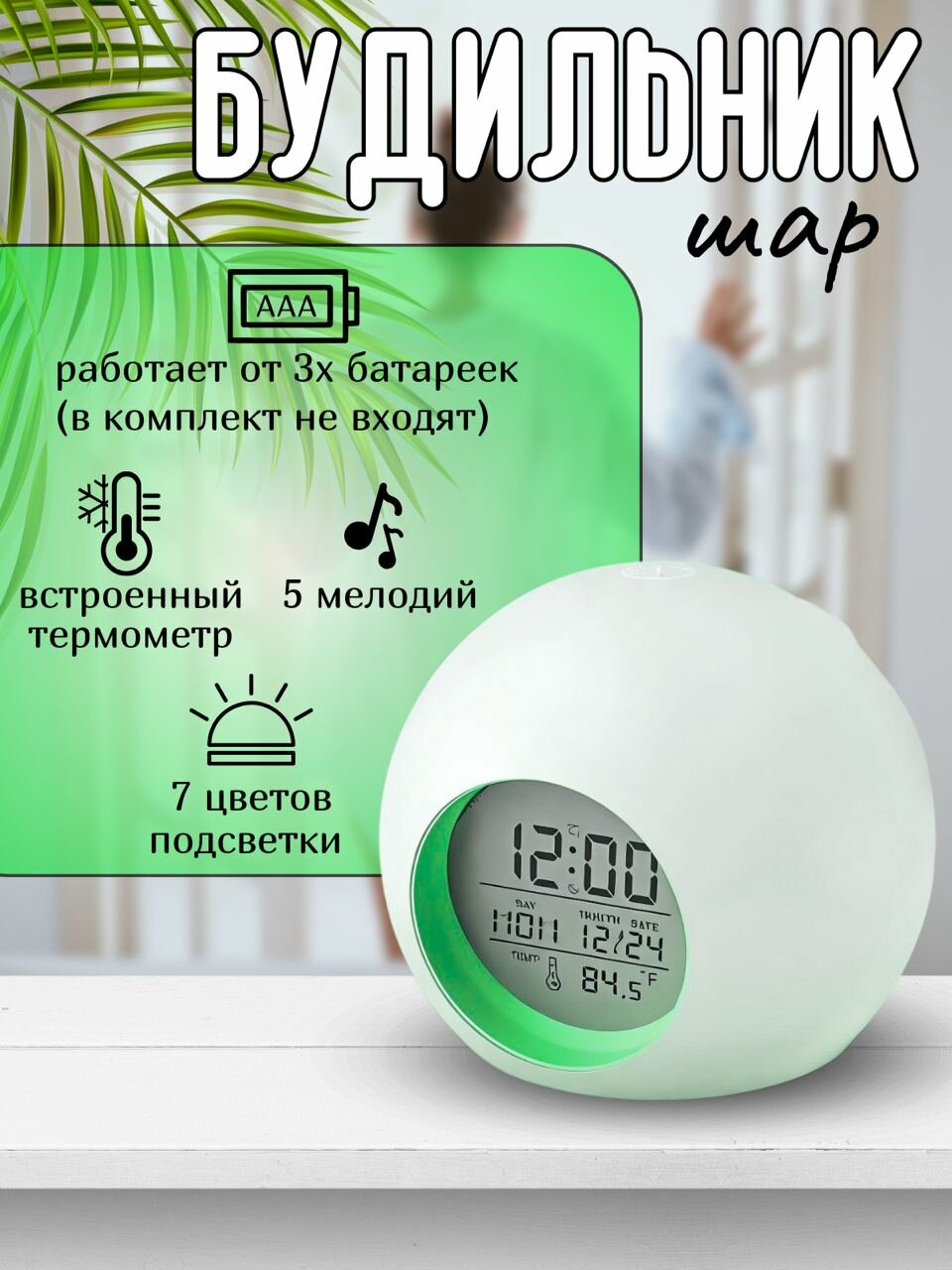 10 цен на Будильник "Шар" со сменой цветов / Настольные музыкальные цифровые часы с разноцветной подсветкой зеленые